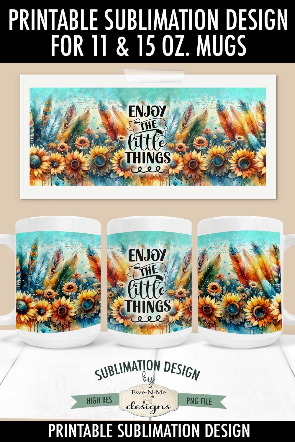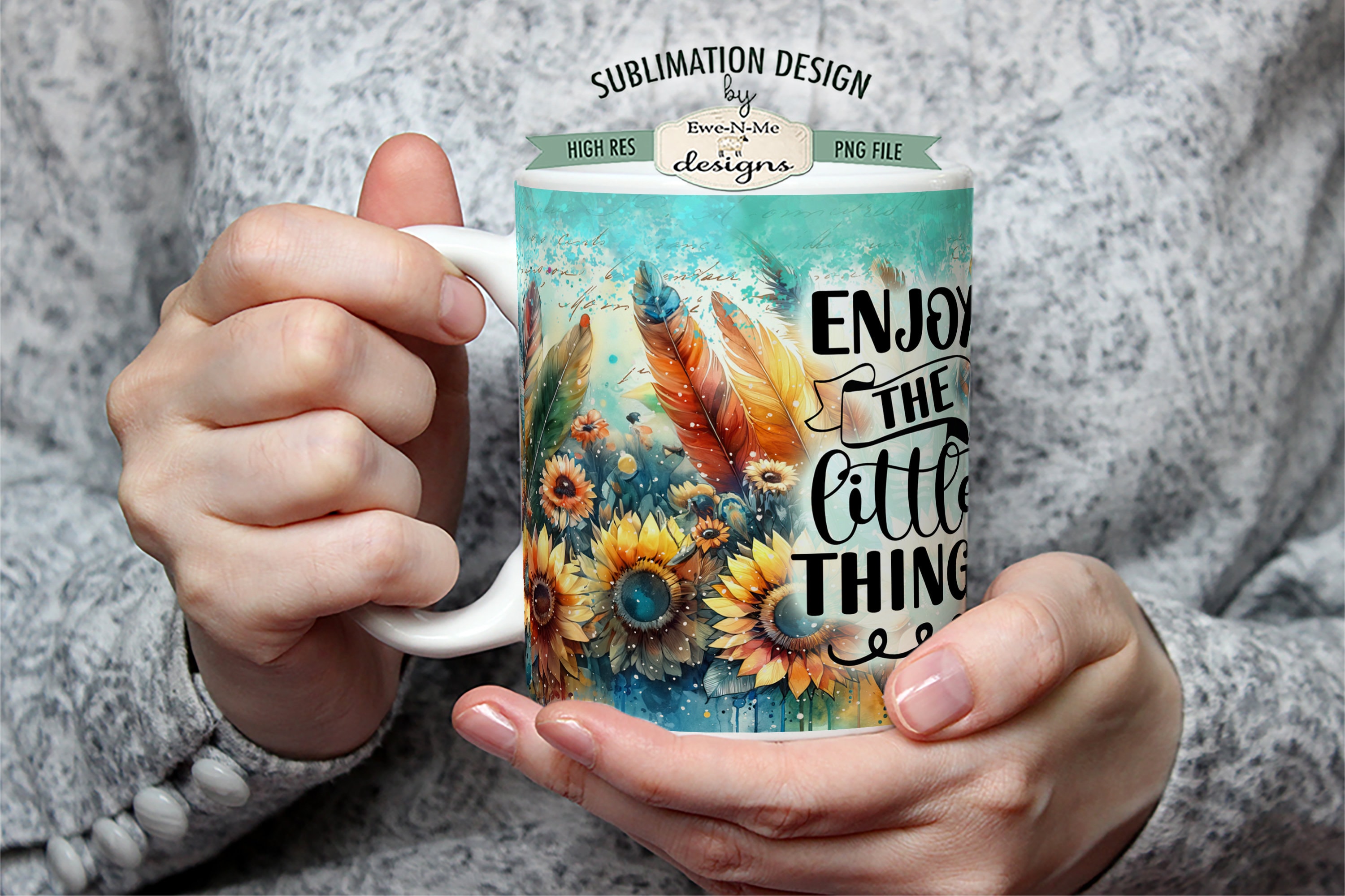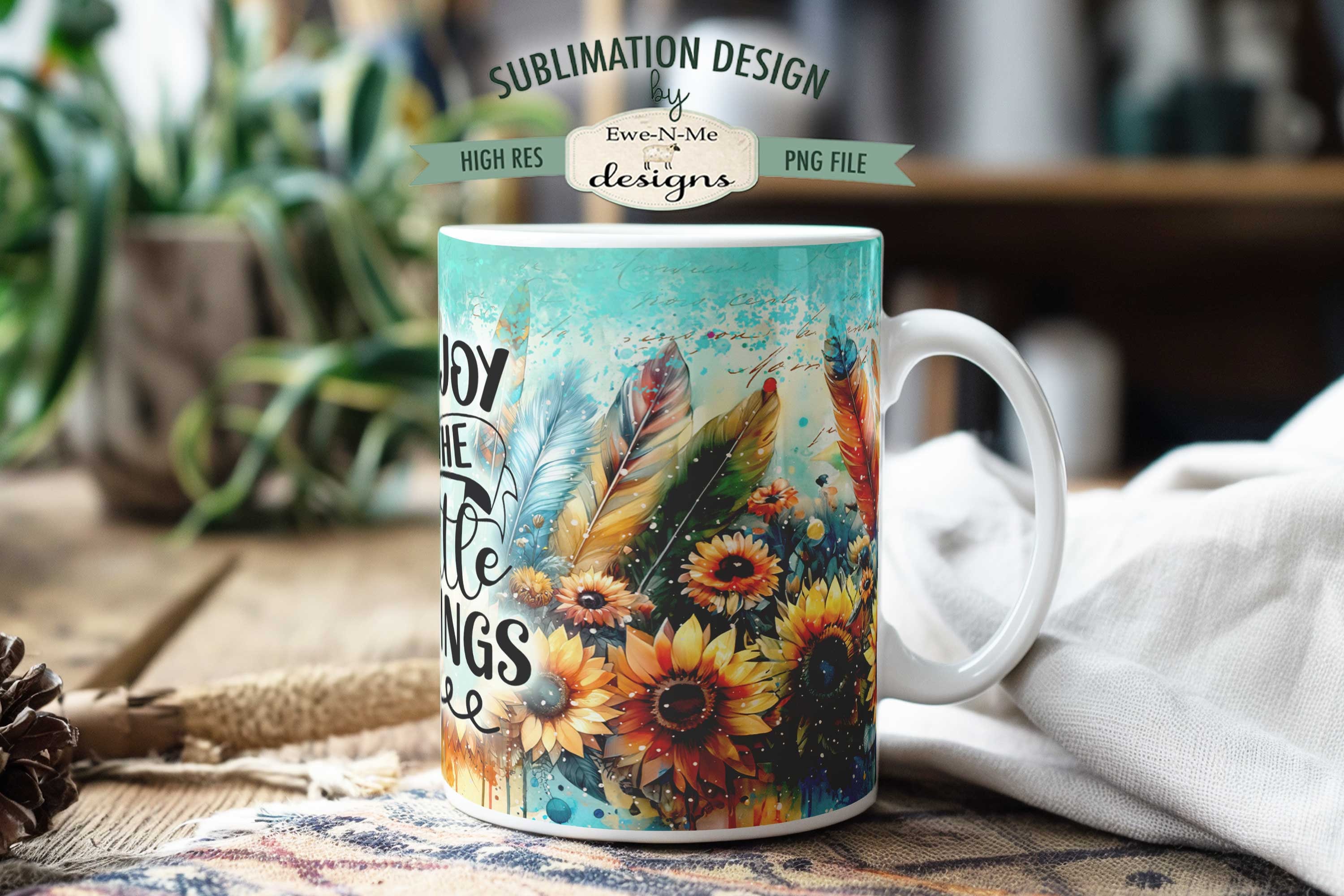 Enjoy The Little Things Boho Sunflower Mug Design - Sunflowers and Feathers - Sunflower 11 and 15 oz. Mug Sublimation Wrap PNG