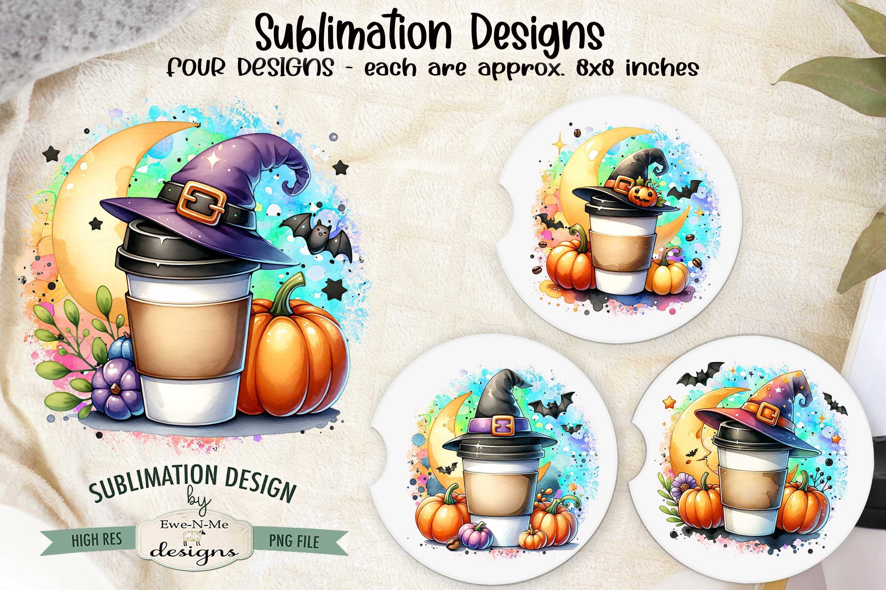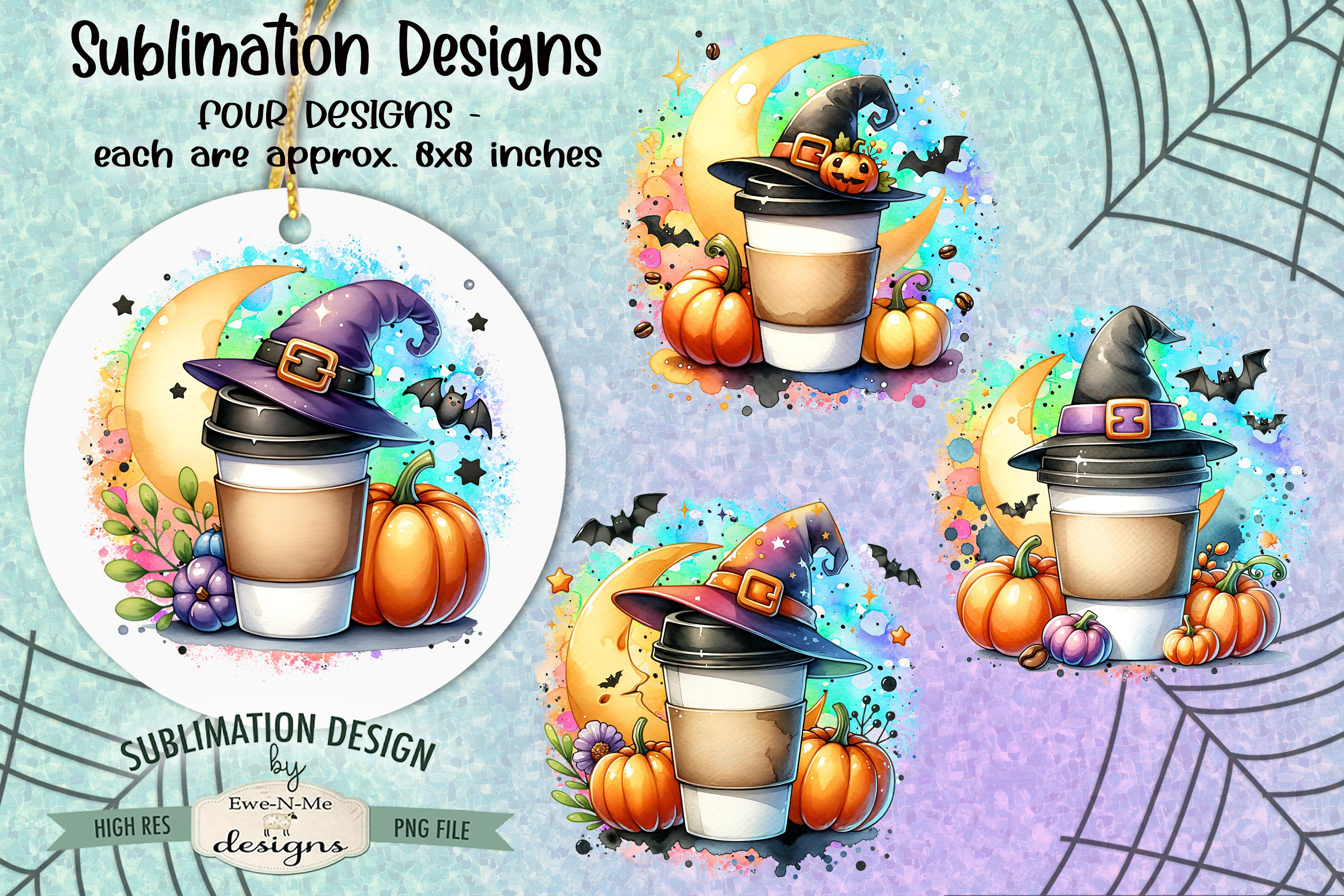 Halloween Coffee Sublimation Designs - Cute Take Out Coffee with a Witch Hat and Pumpkins - Witch Coffee - Four PNG Designs for Coffee Lover