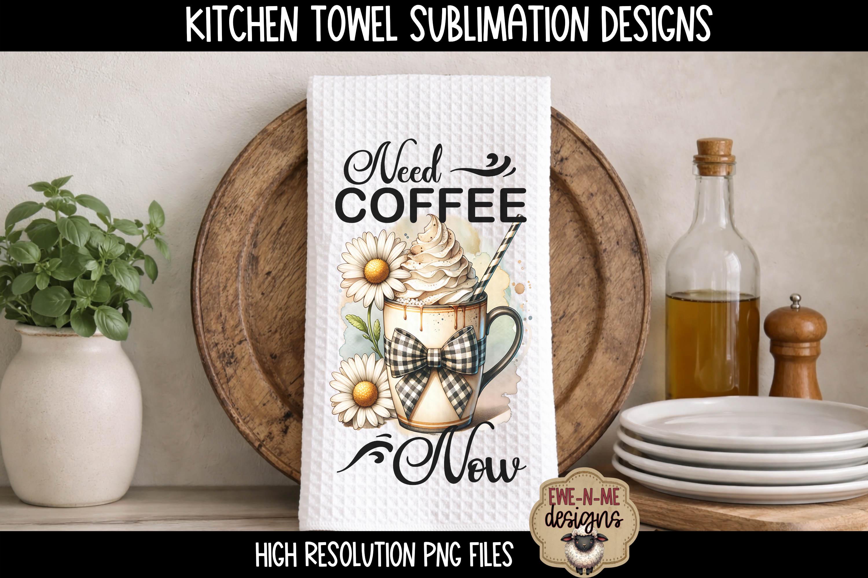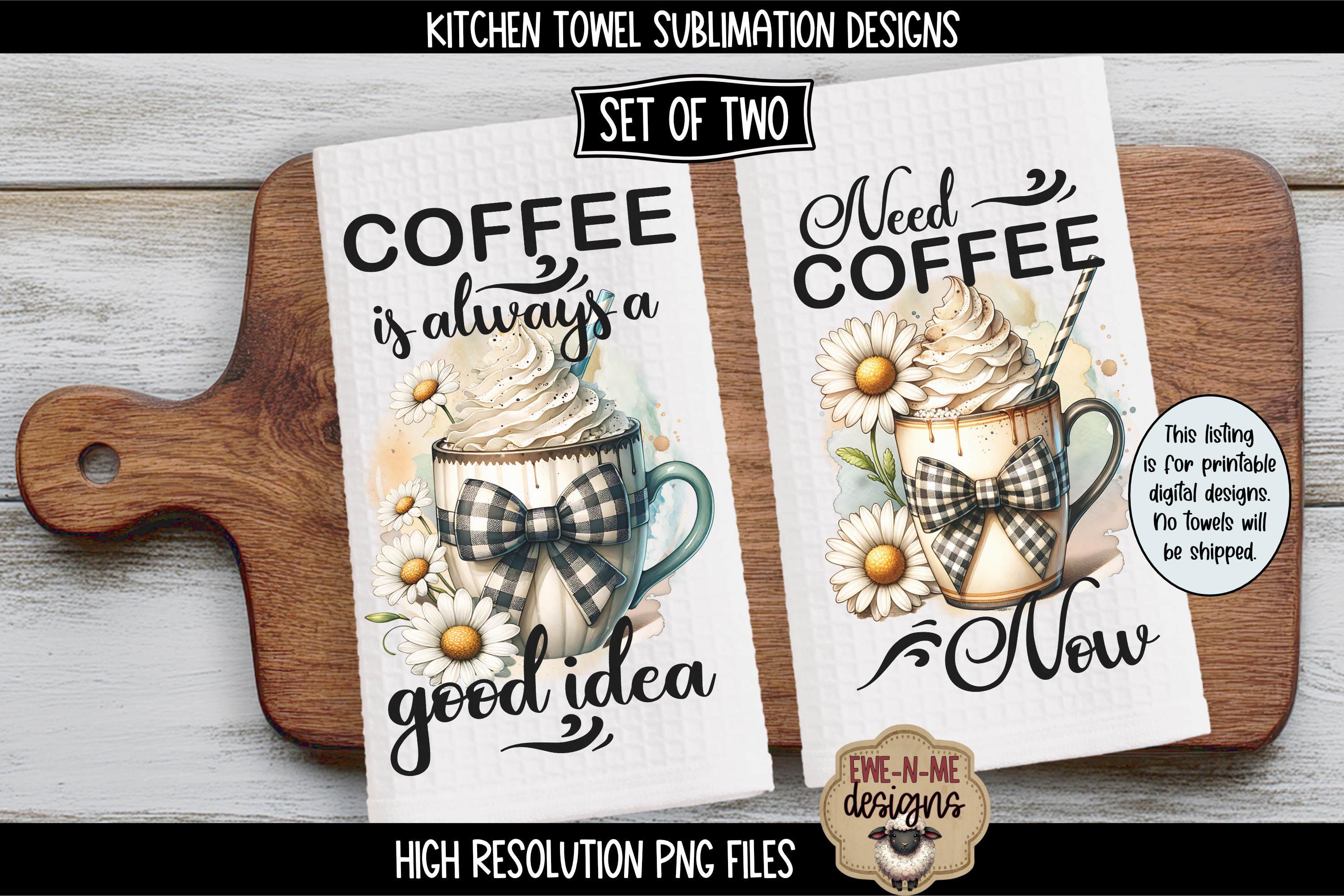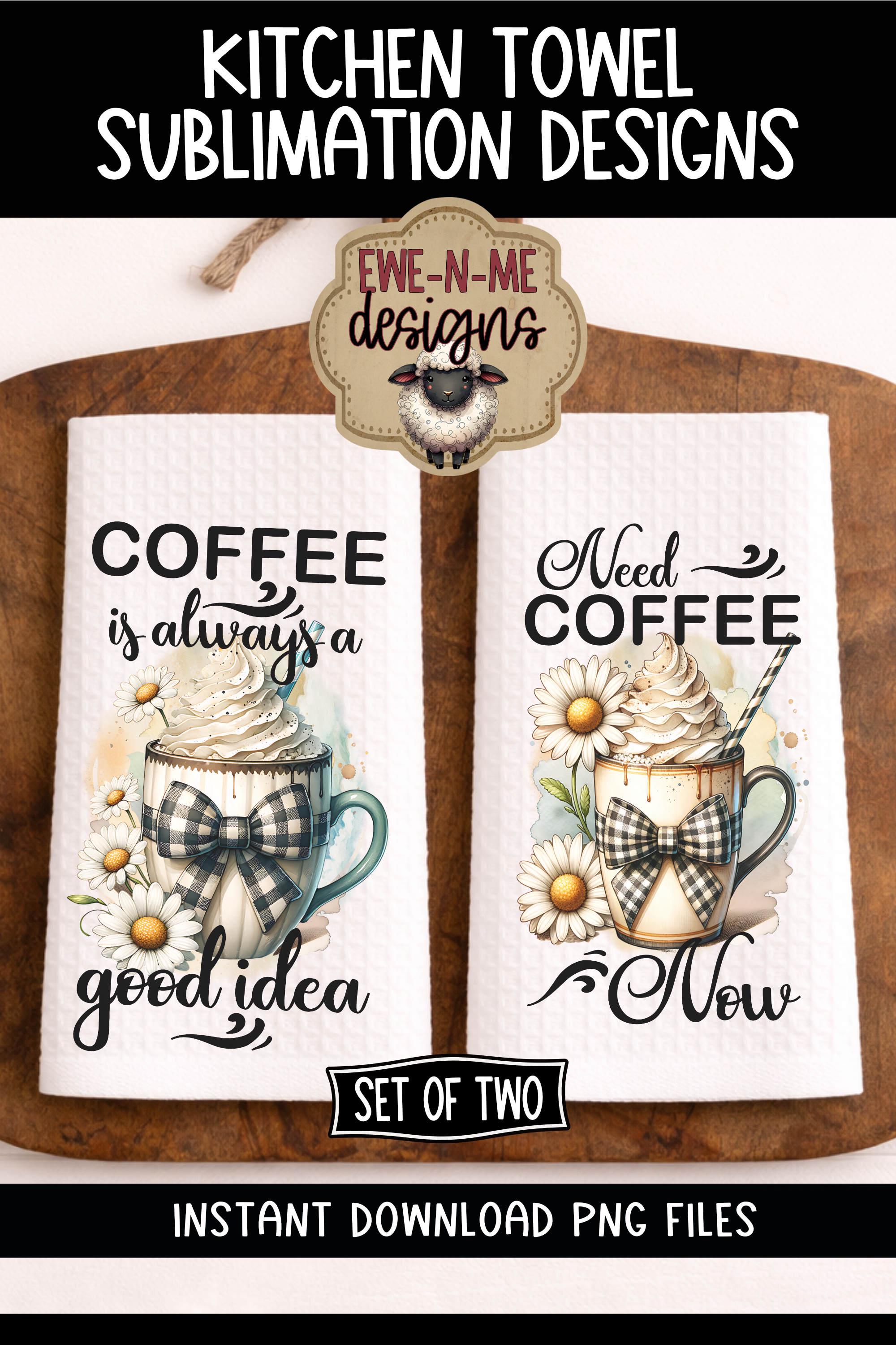Includes 2 coordinating coffee-themed kitchen towel sublimation designs featuring cozy coffee mugs with plaid bows, daisies, and fun coffee quotes. Perfect for farmhouse kitchens, coffee lovers, and everyday kitchen decor.