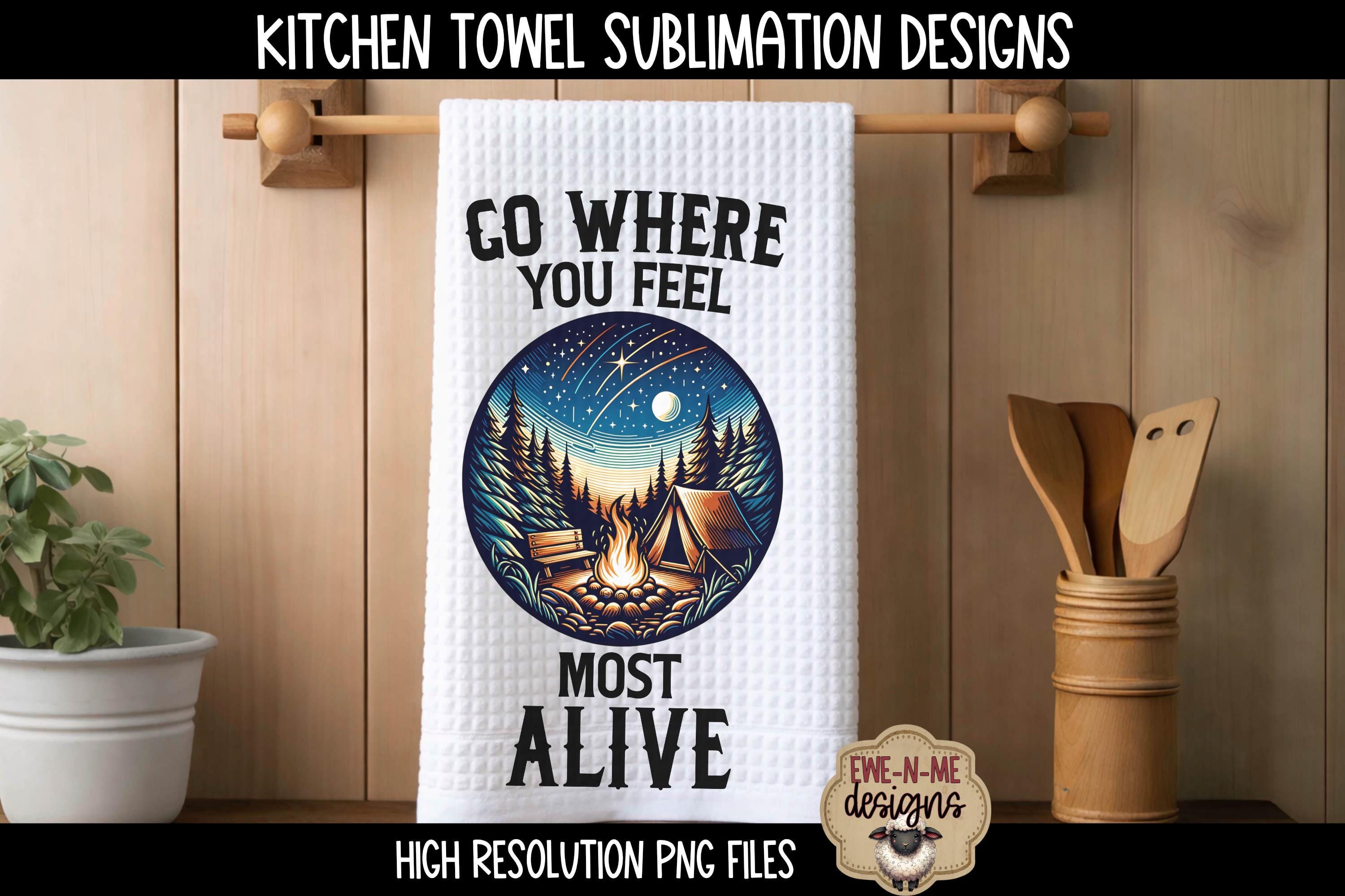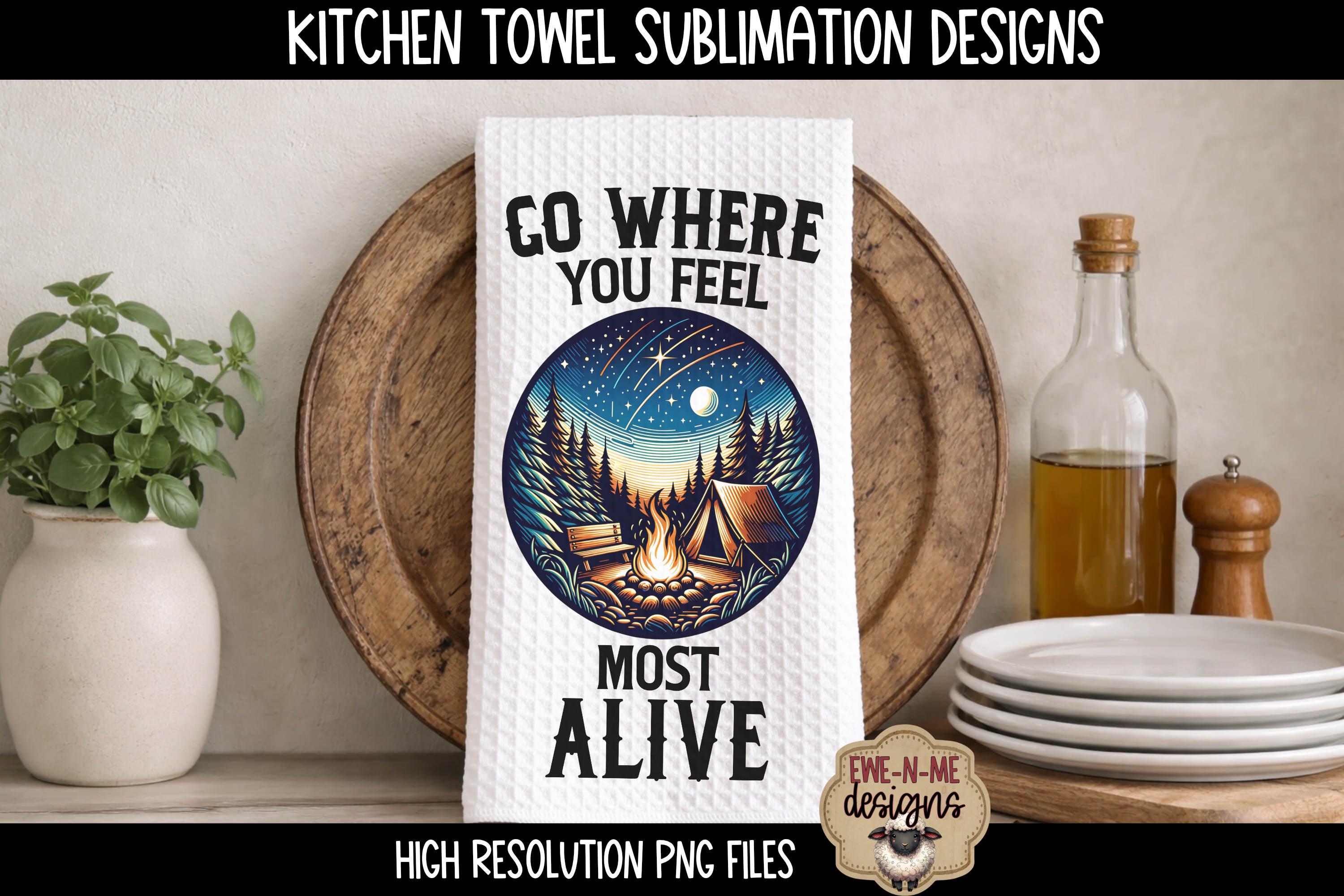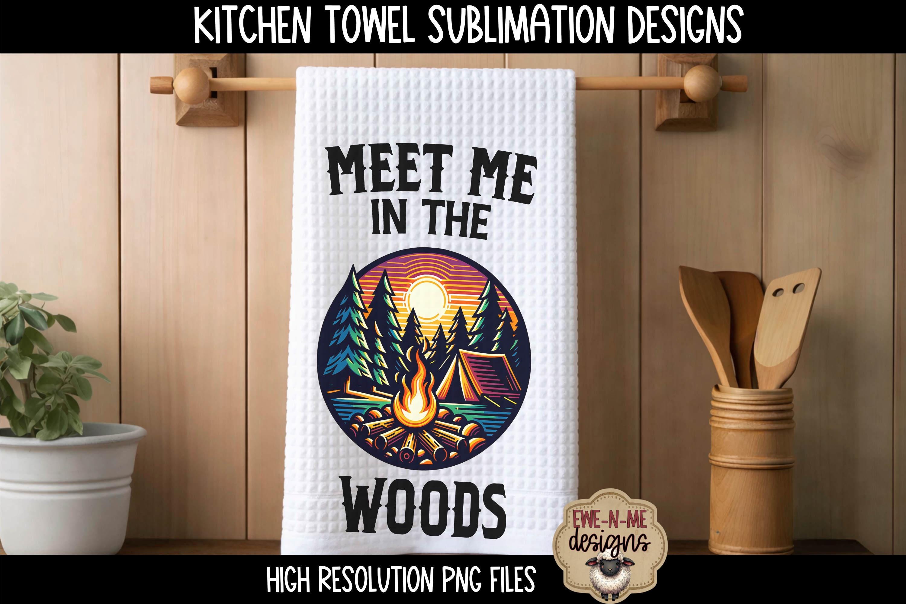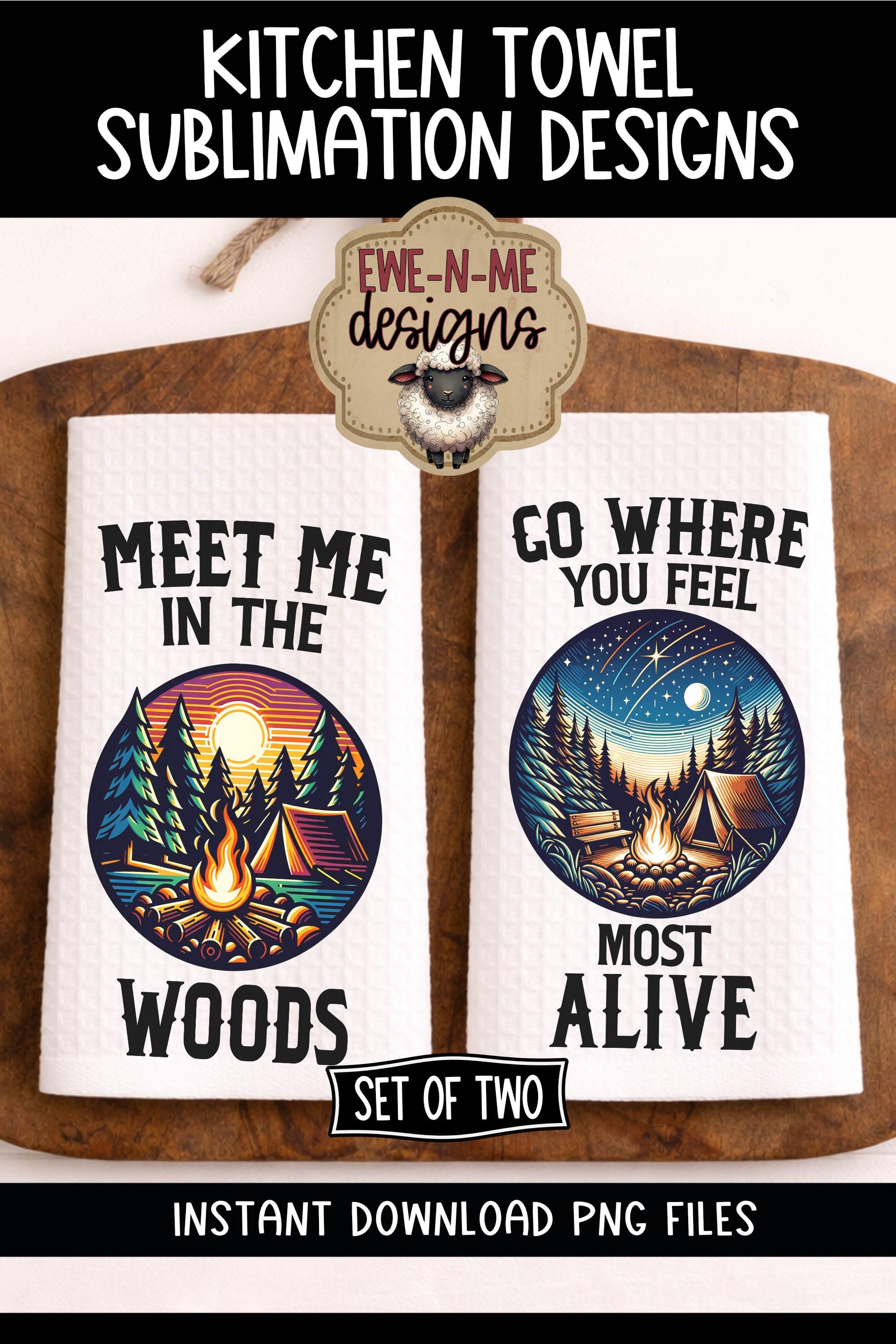 Includes 2 coordinating camping-themed kitchen towel sublimation designs featuring cozy campfire scenes in the woods. Perfect for rustic, outdoor, or cabin-style kitchen projects.