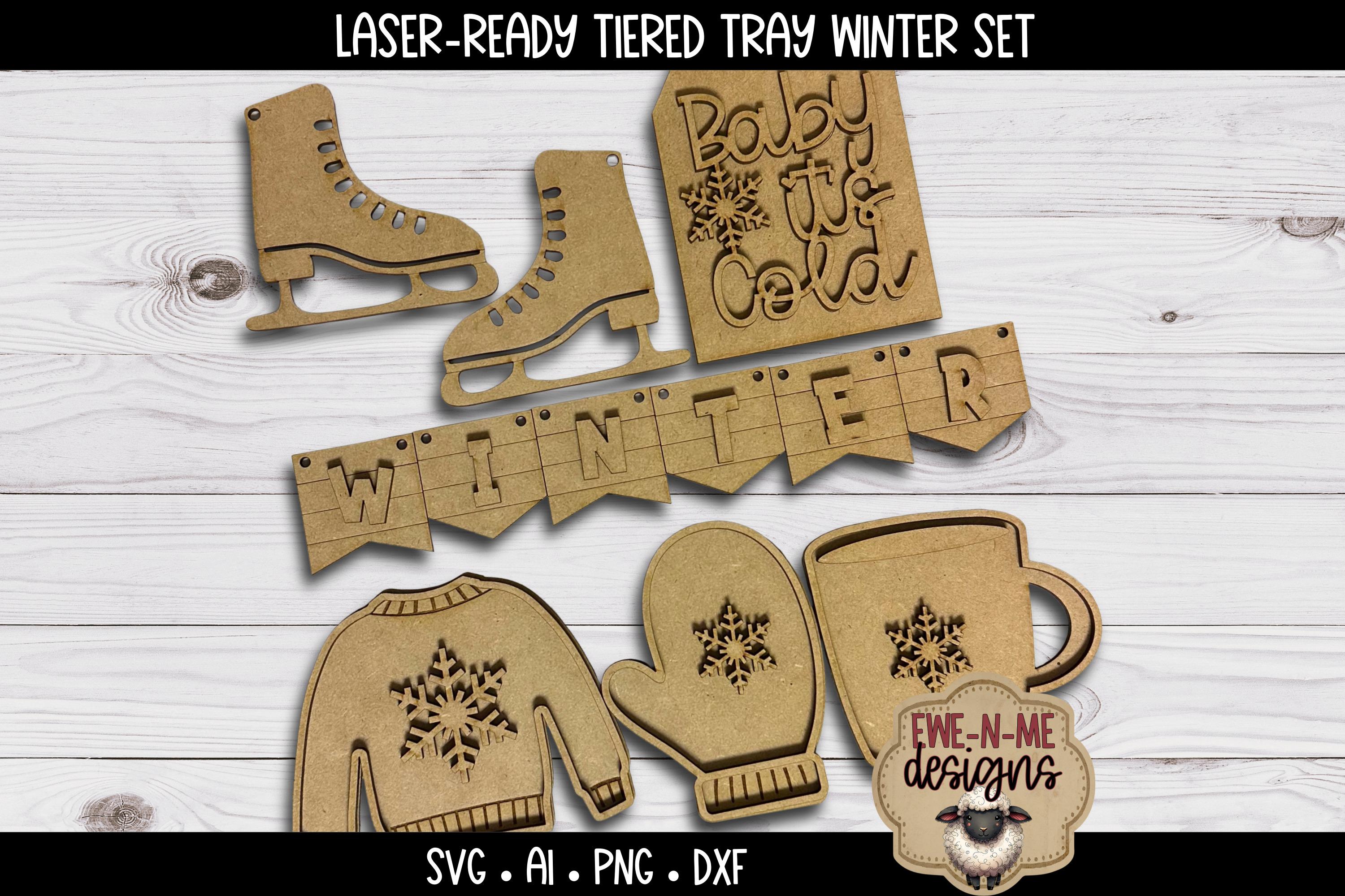 This Winter Tiered Tray Laser File Set features mittens, sweaters, ice skates, and cocoa mugs – perfect for farmhouse winter decor with your Glowforge or Lightburn.