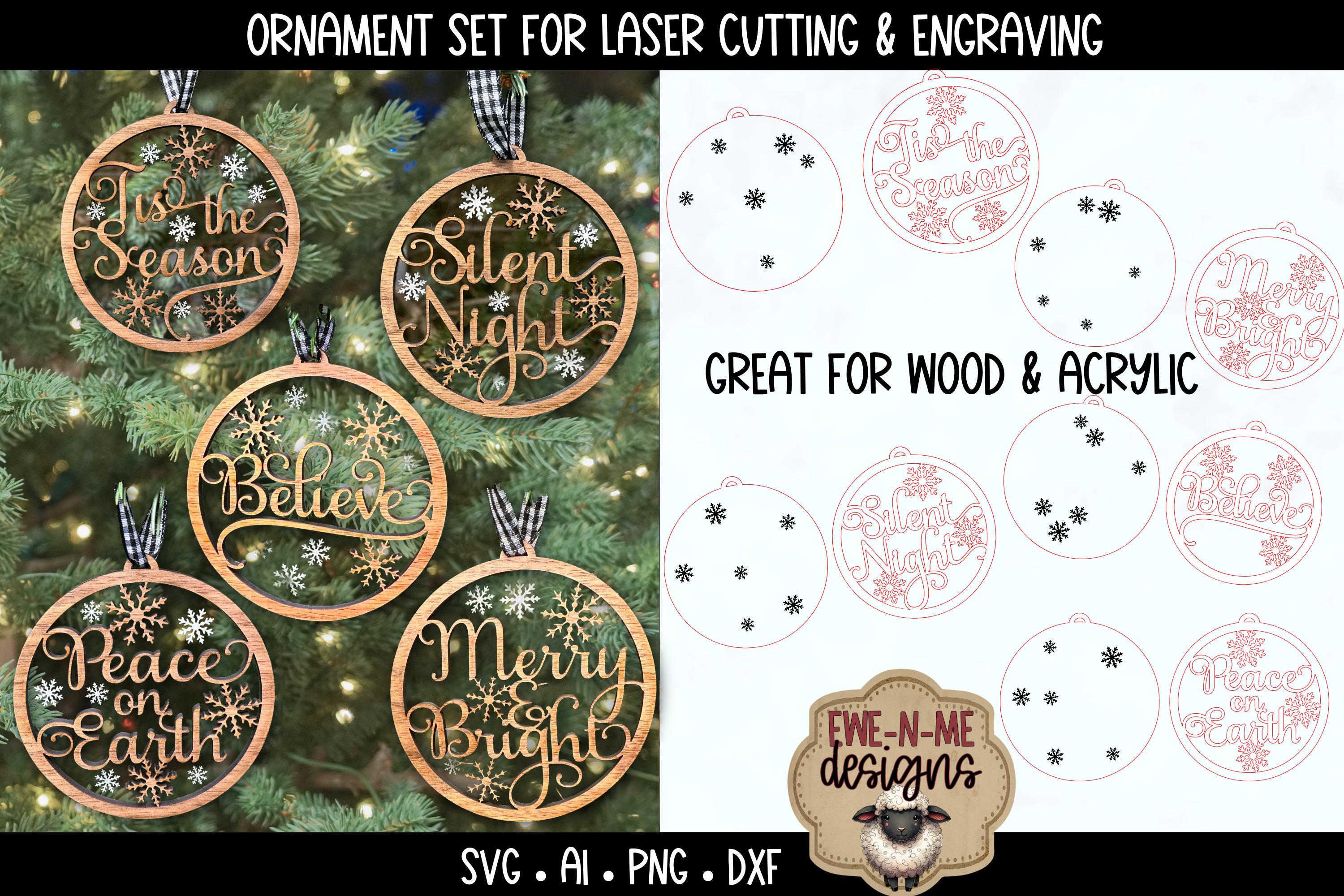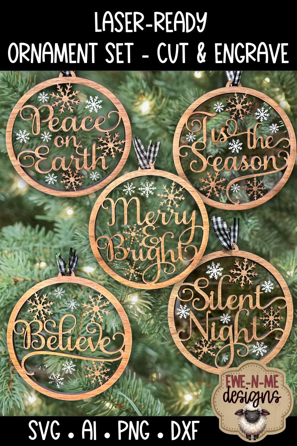 Bring a touch of classic holiday magic to your Christmas tree or craft booth with this bundle of 5 layered word ornaments. Each design features a delicate script word with snowflake accents on a wood top layer and a second engraved acrylic backer - simple to cut, easy to assemble, and stunning when finished.