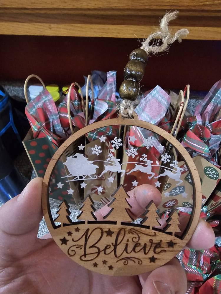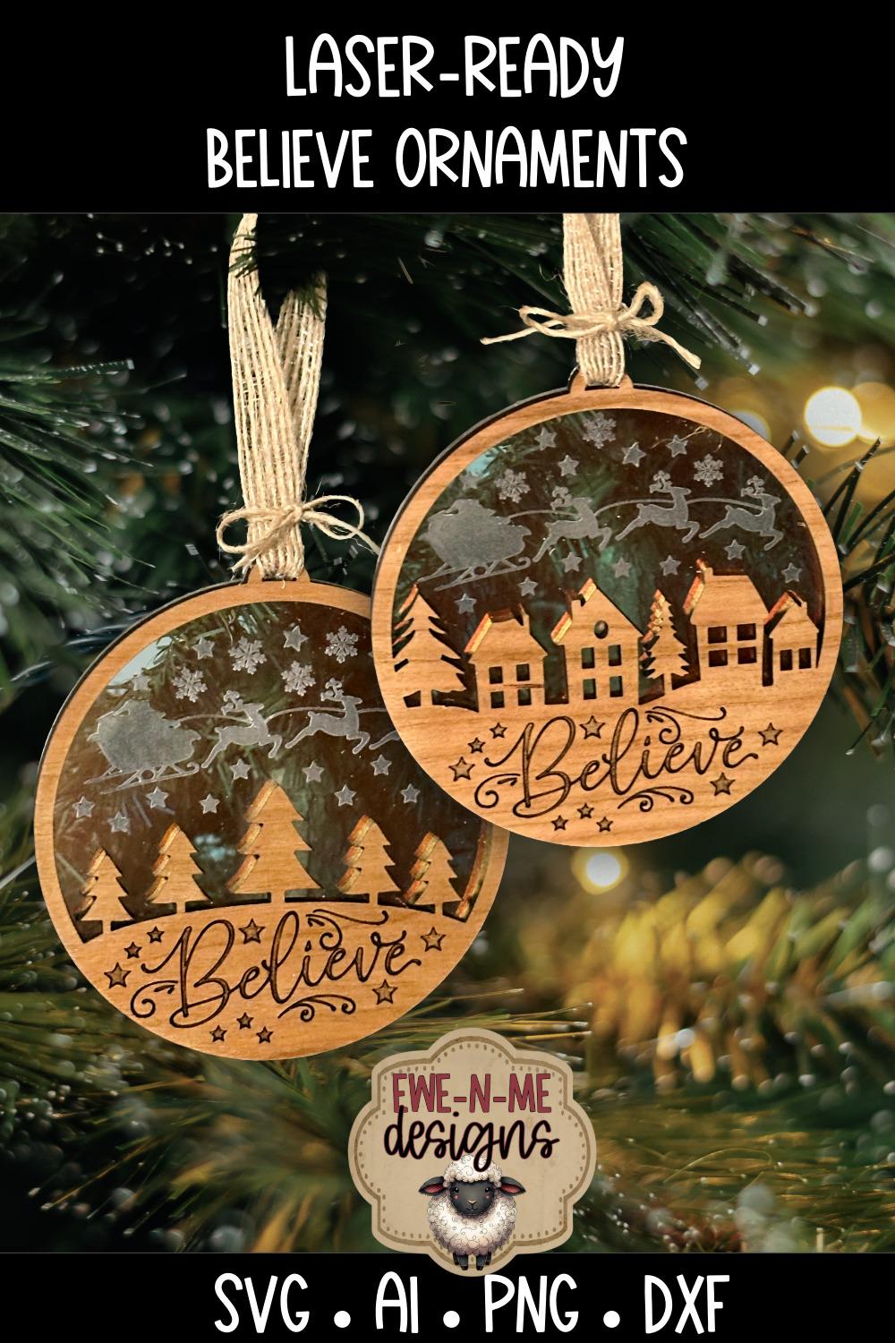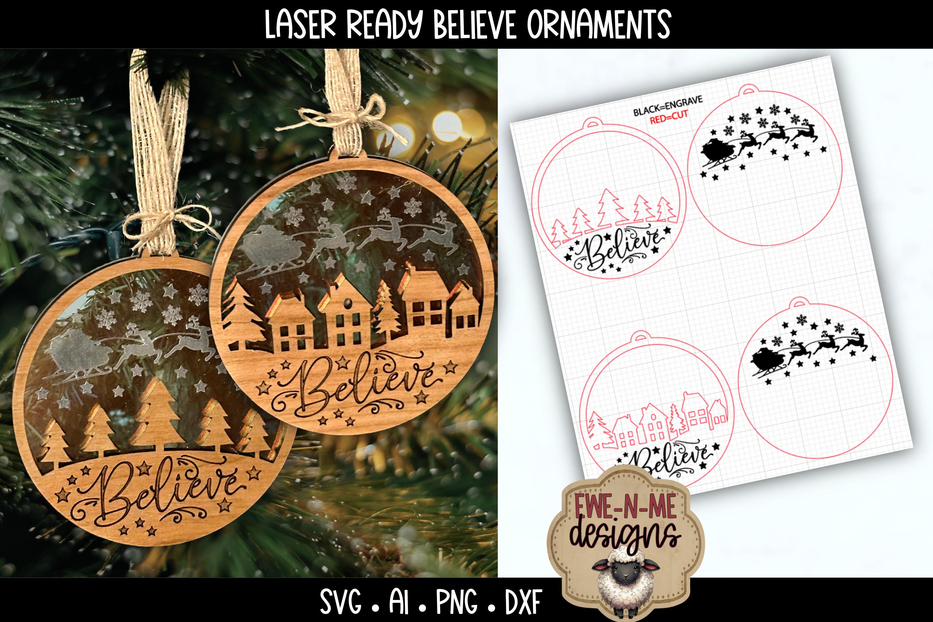 Bring a touch of classic holiday magic to your Christmas tree or craft booth with this pair of 2 layered word ornaments. Each design features the word BELIEVE in a delicate script with snowflake and star accents on a wood top layer and a second engraved acrylic backer - simple to cut, easy to assemble, and stunning when finished.