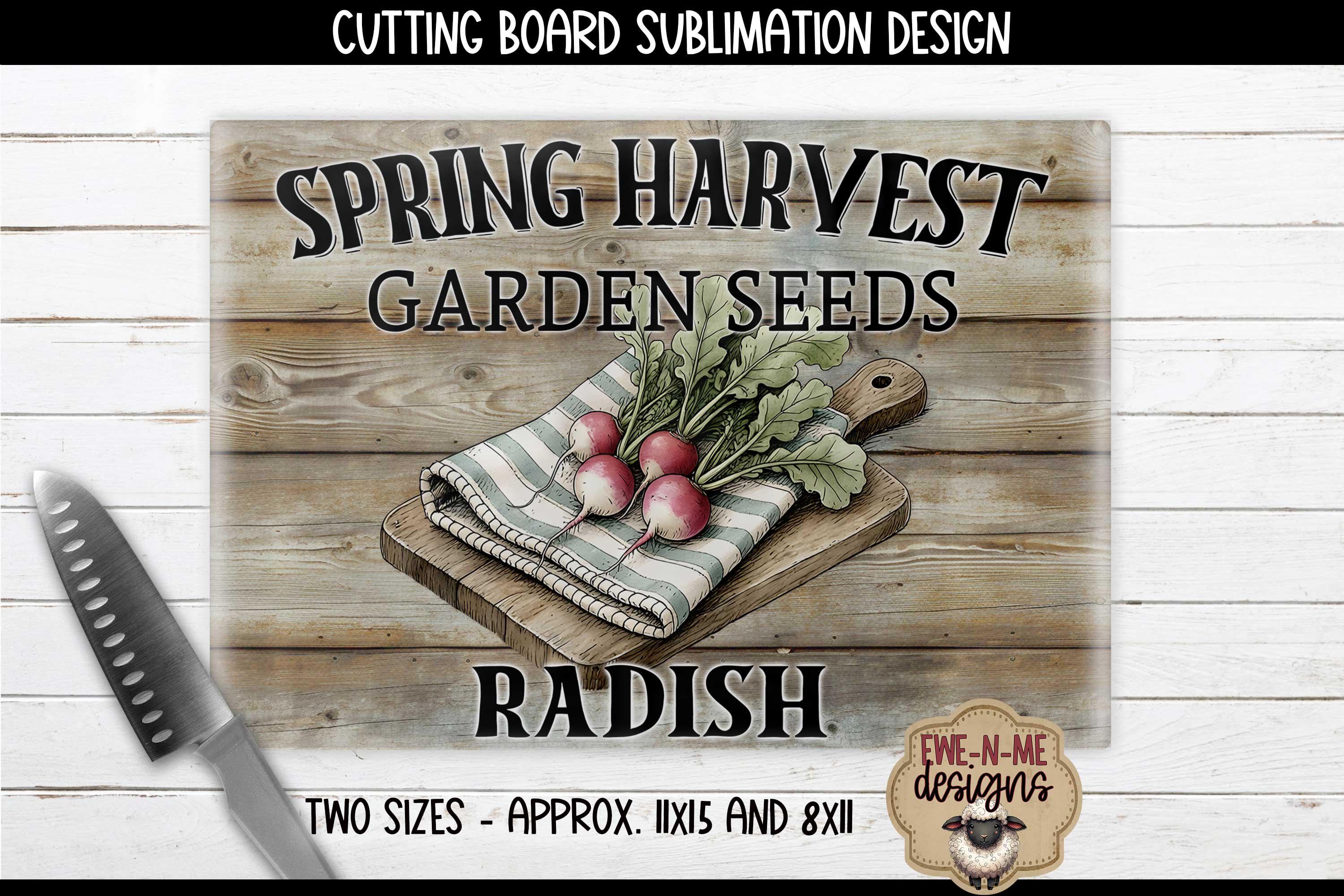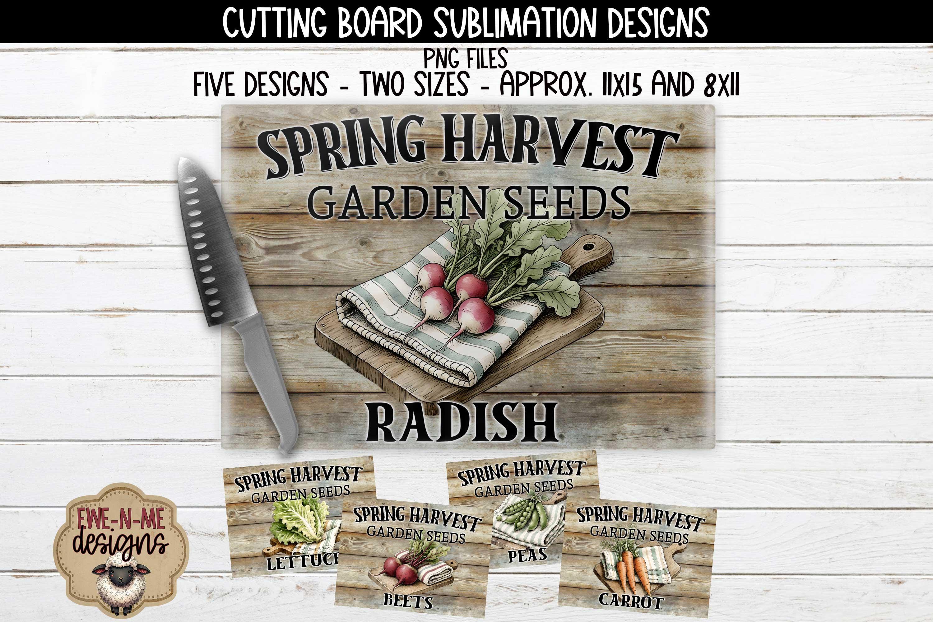 This set includes five coordinating vegetable designs in a vintage seed packet style, created with sublimation cutting boards in mind, but versatile enough for a variety of sublimation-ready blanks.
