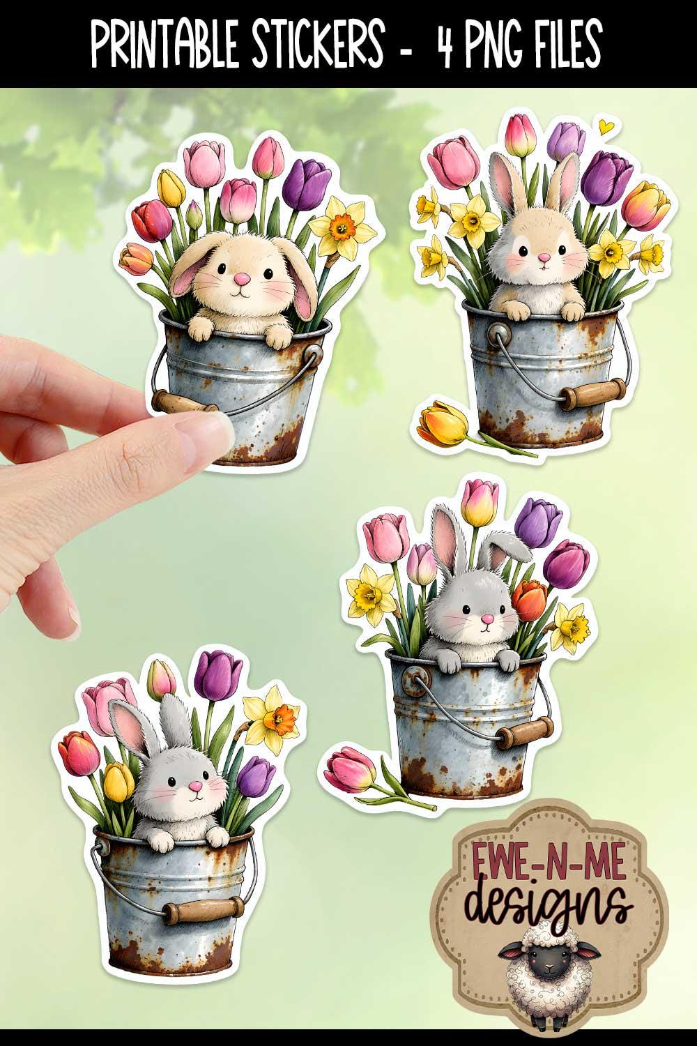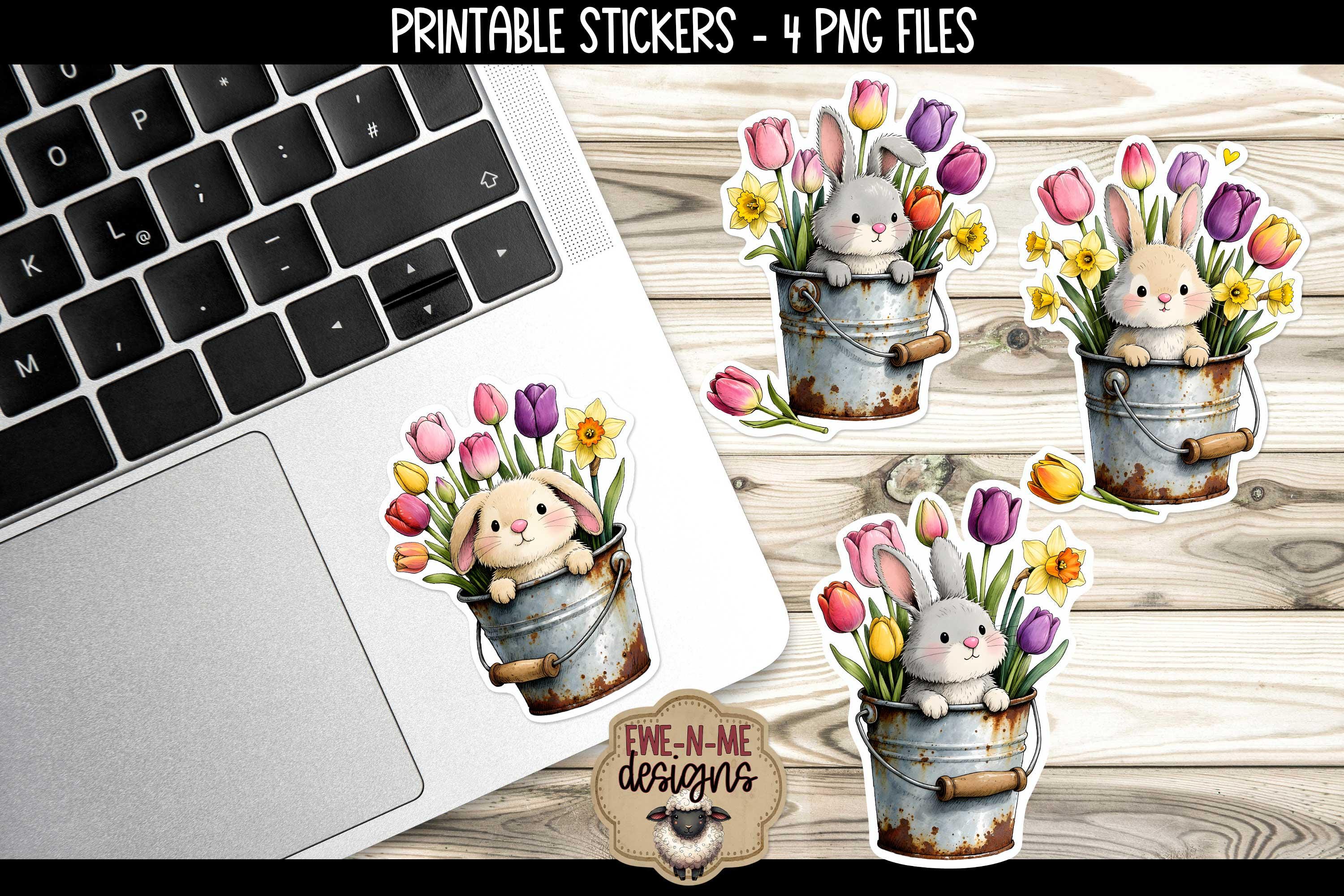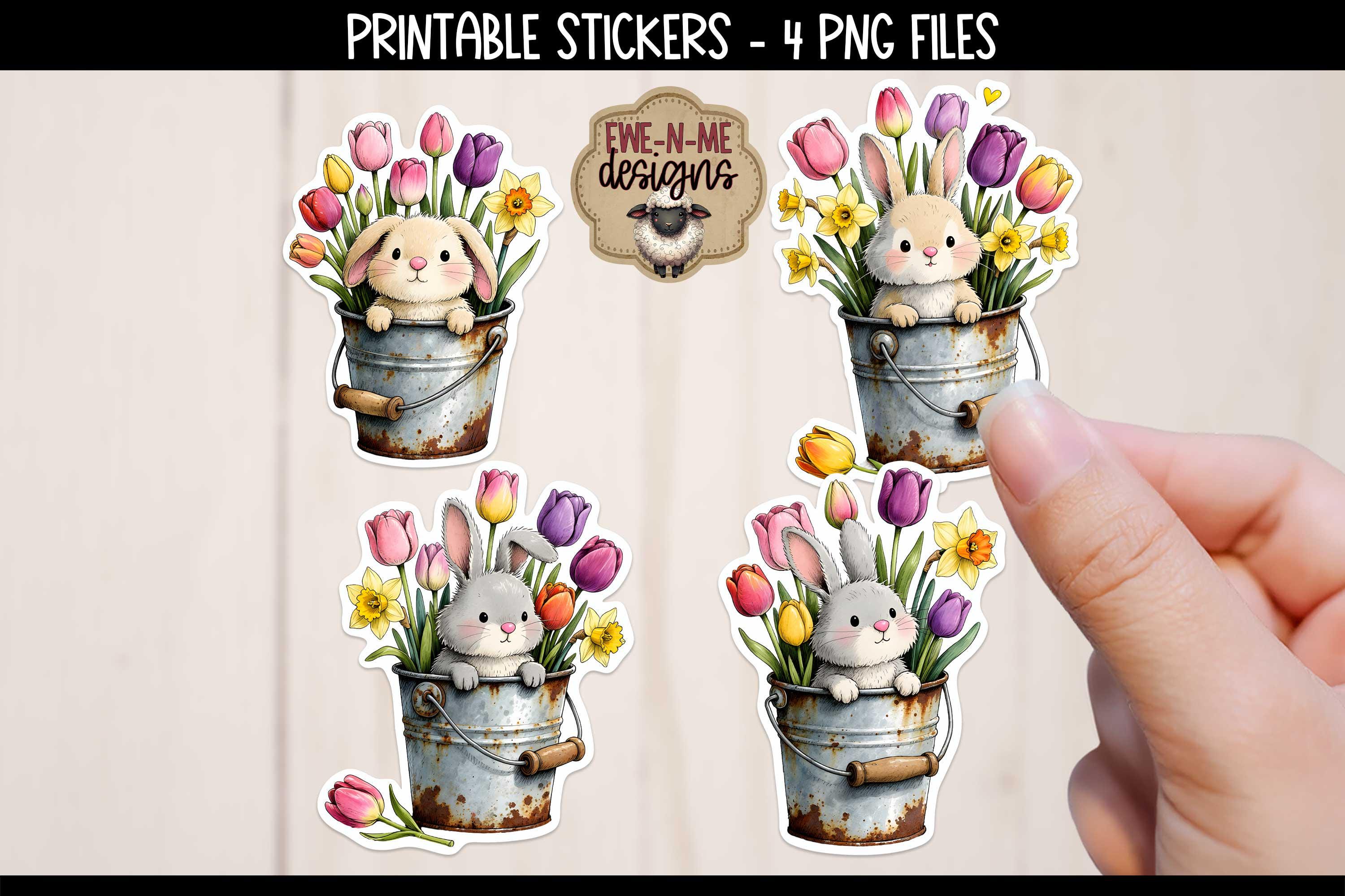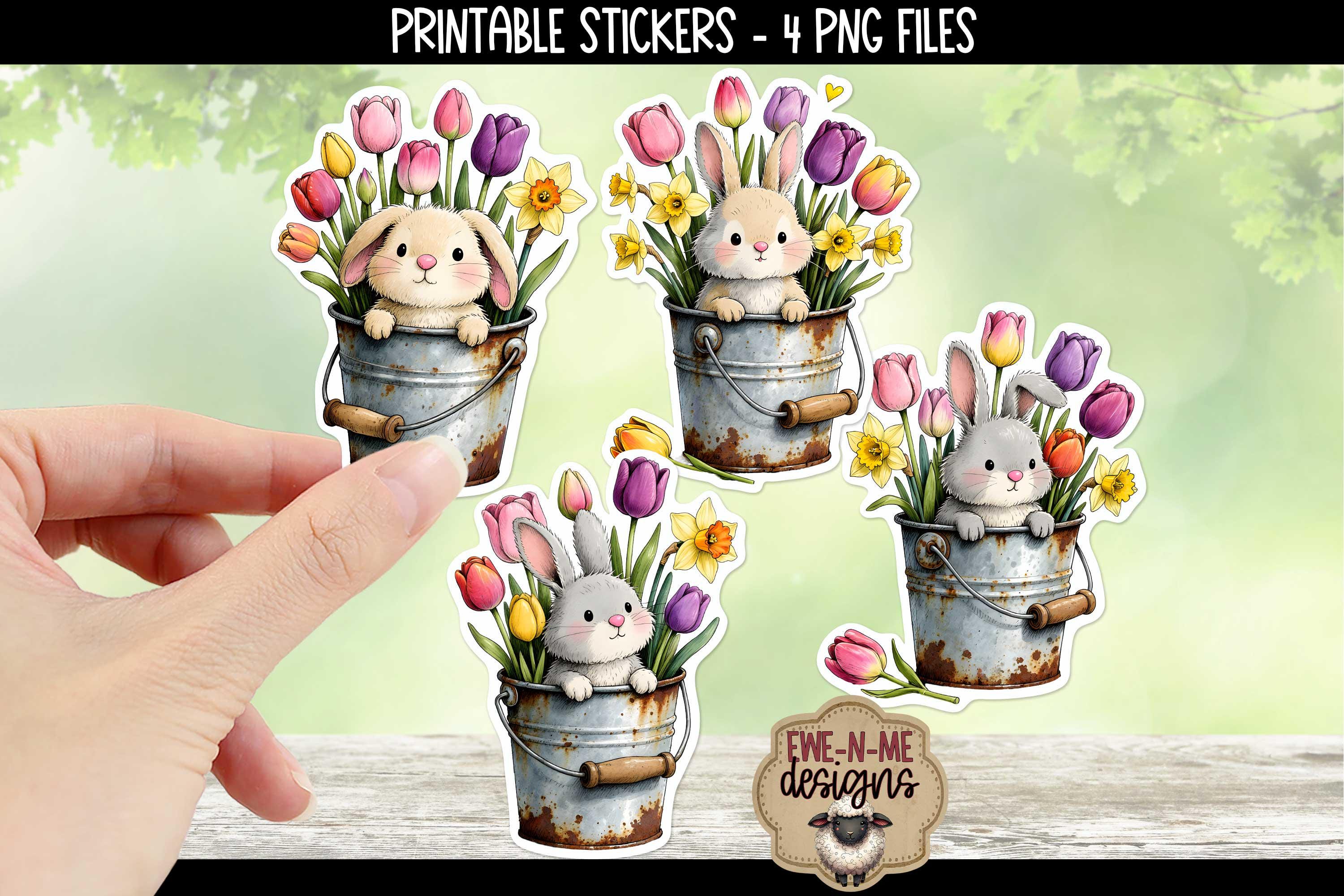 This collection features four sweet bunnies peeking out of a rusty bucket with spring flowers, perfect for adding whimsy and fun to Easter and spring-themed creations.