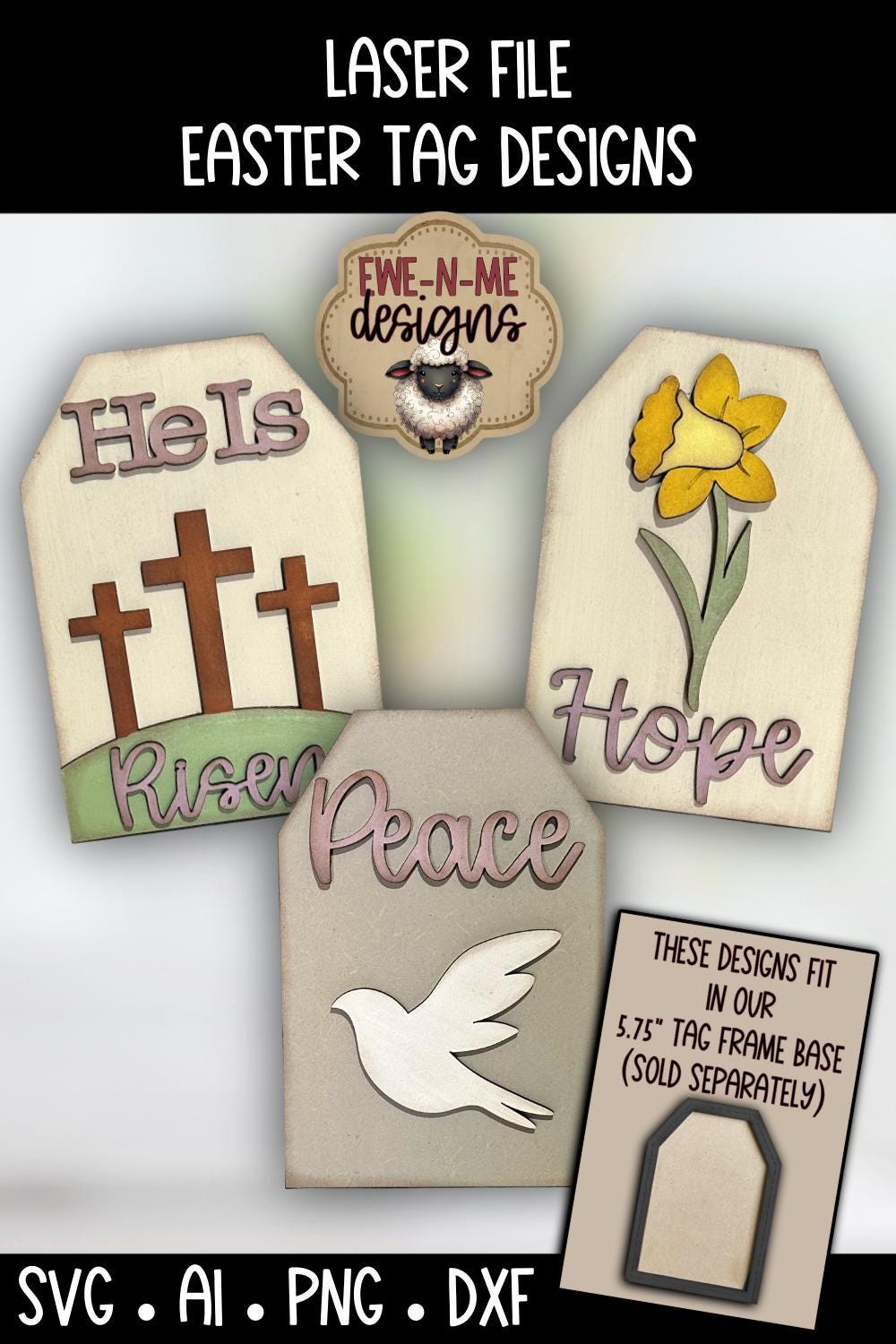 Celebrate the meaning of Easter with this beautiful faith-inspired Easter tag laser file bundle. These interchangeable tag inserts feature three uplifting designs: He Is Risen, Peace, and Hope - perfect for creating meaningful spring decor or handmade gifts.