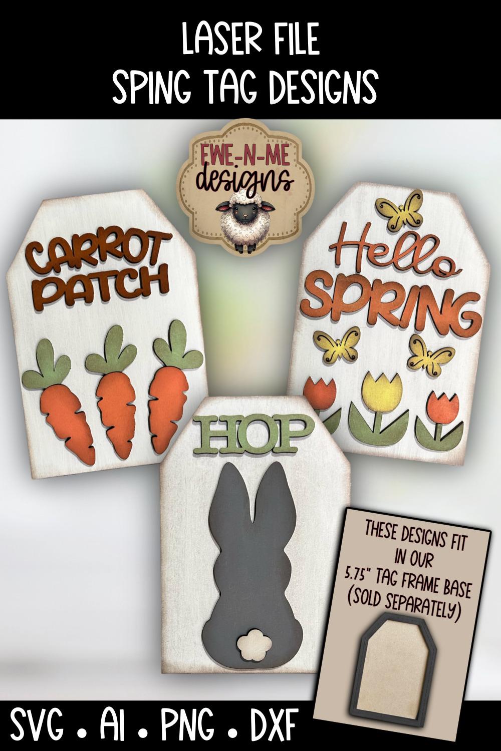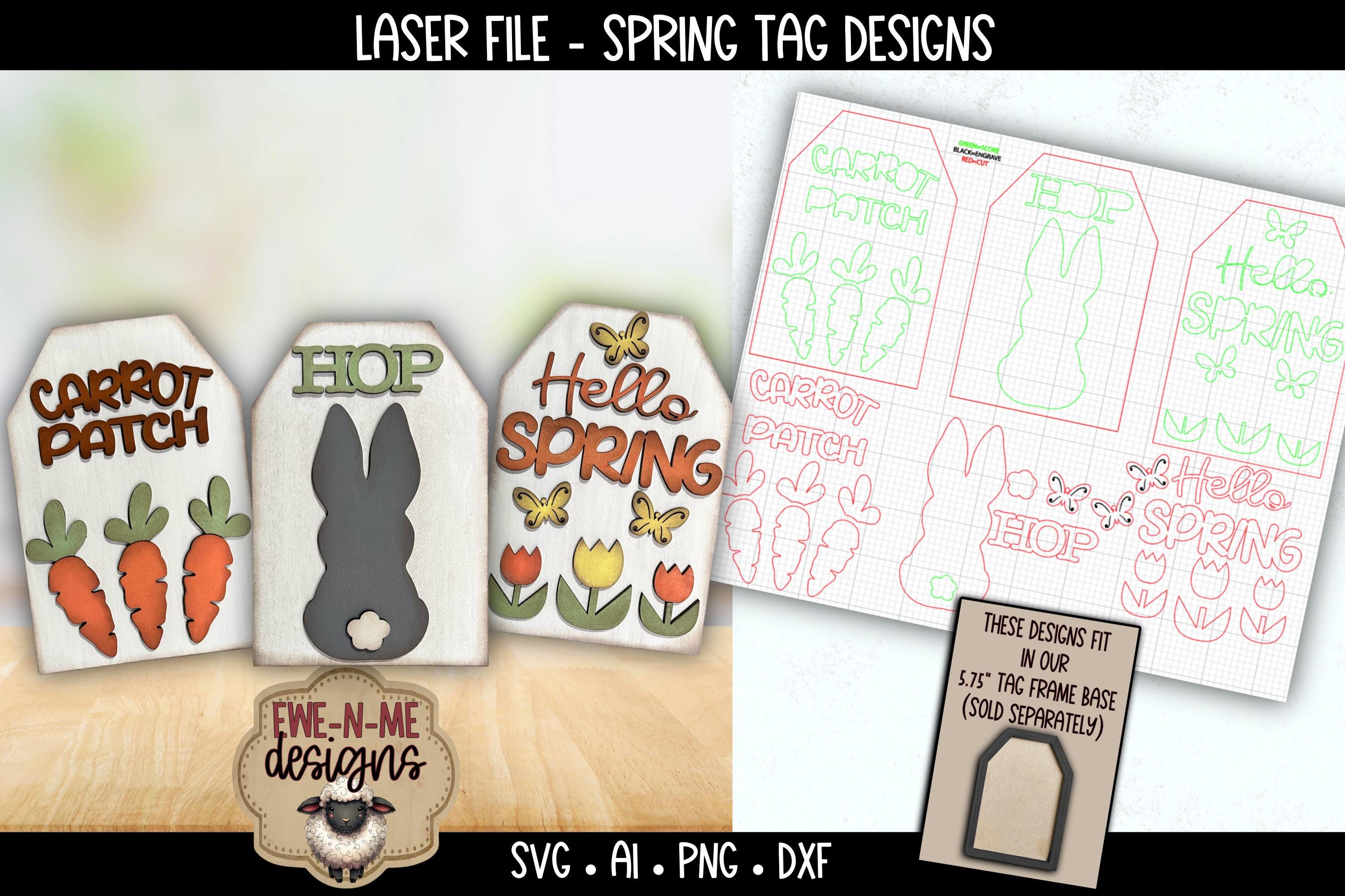 Add a cheerful touch of spring to your decor with this Spring Tag Laser File Bundle featuring three fun seasonal designs: Carrot Patch, Hop, and Hello Spring.