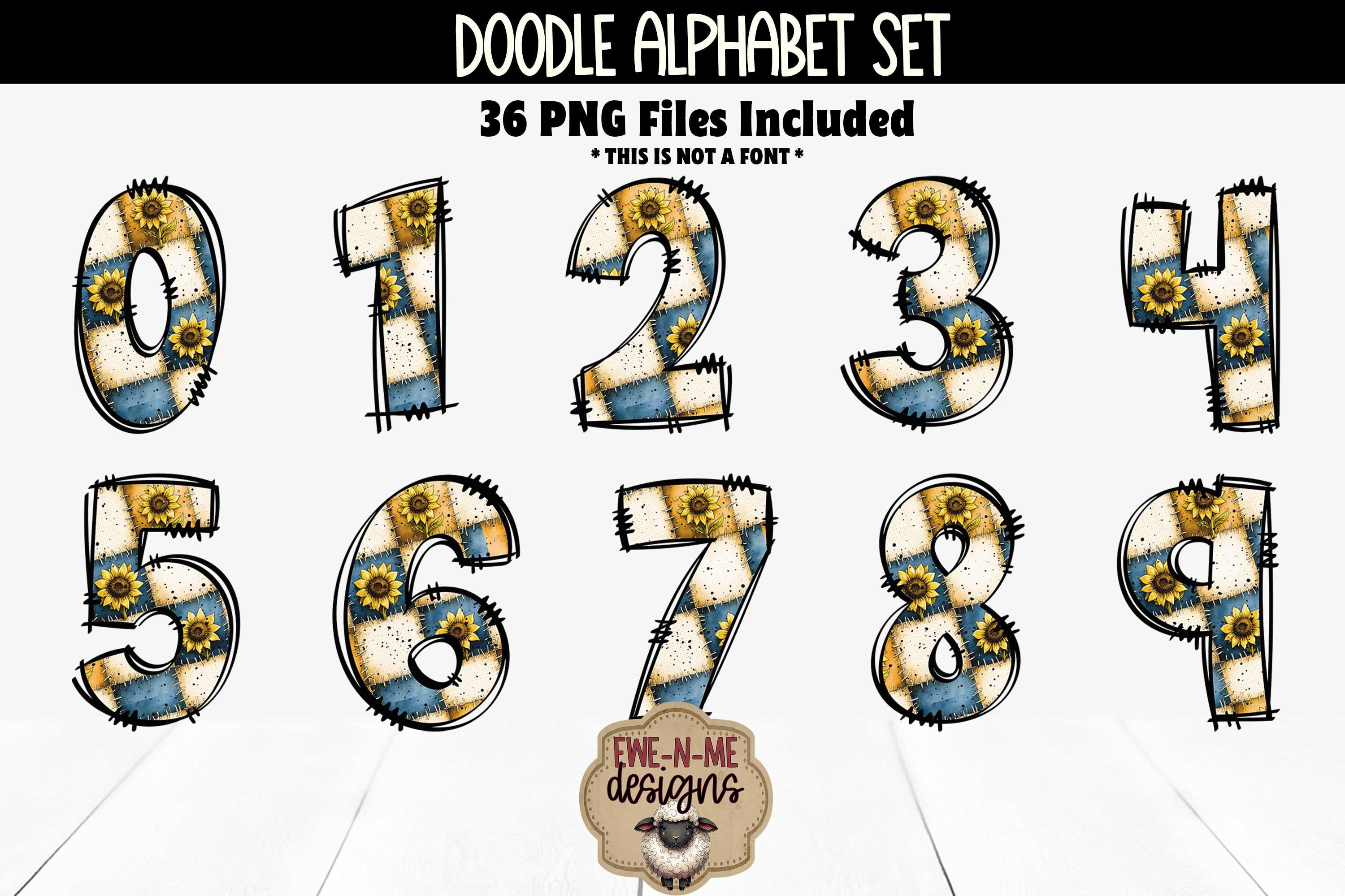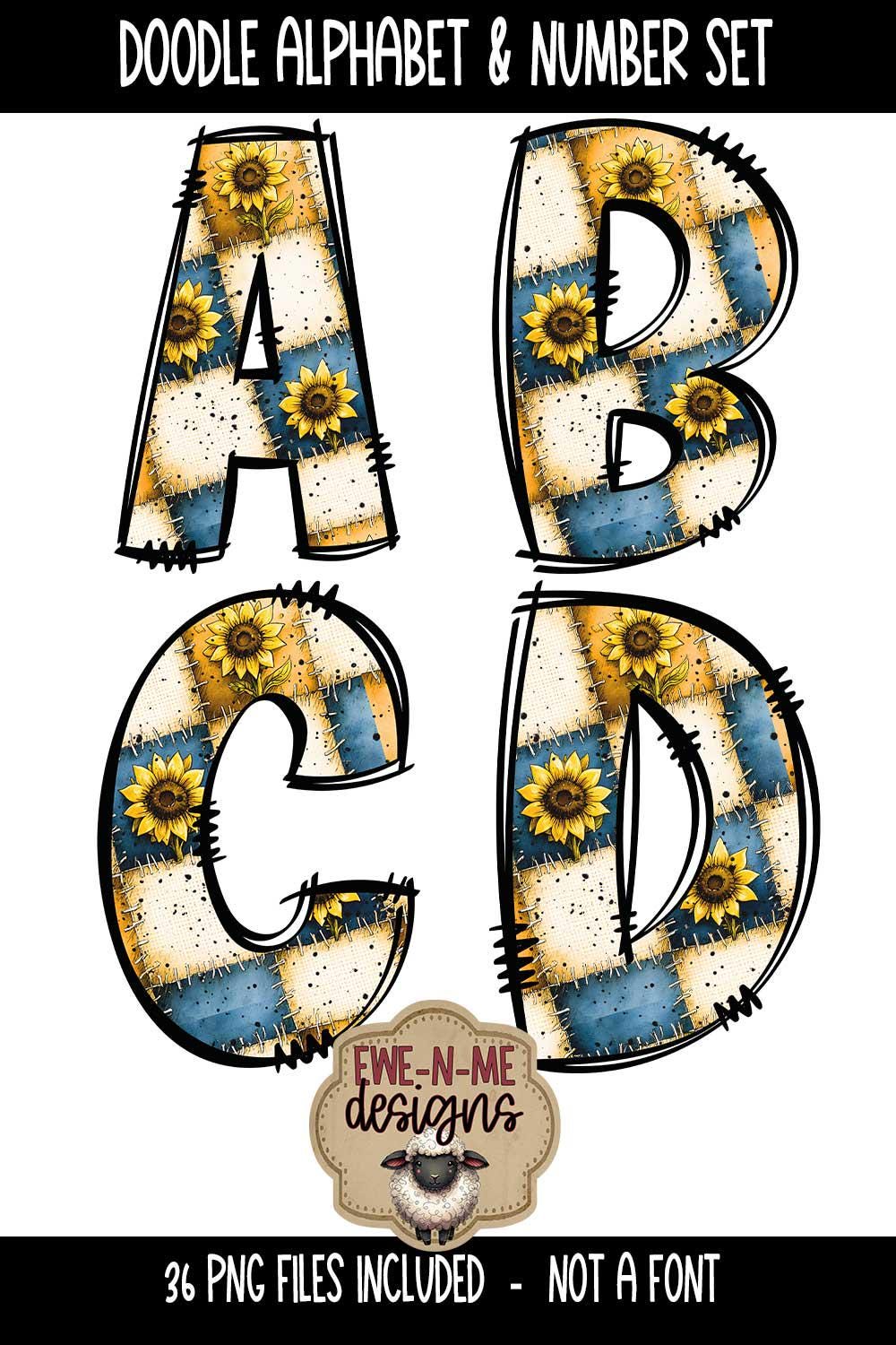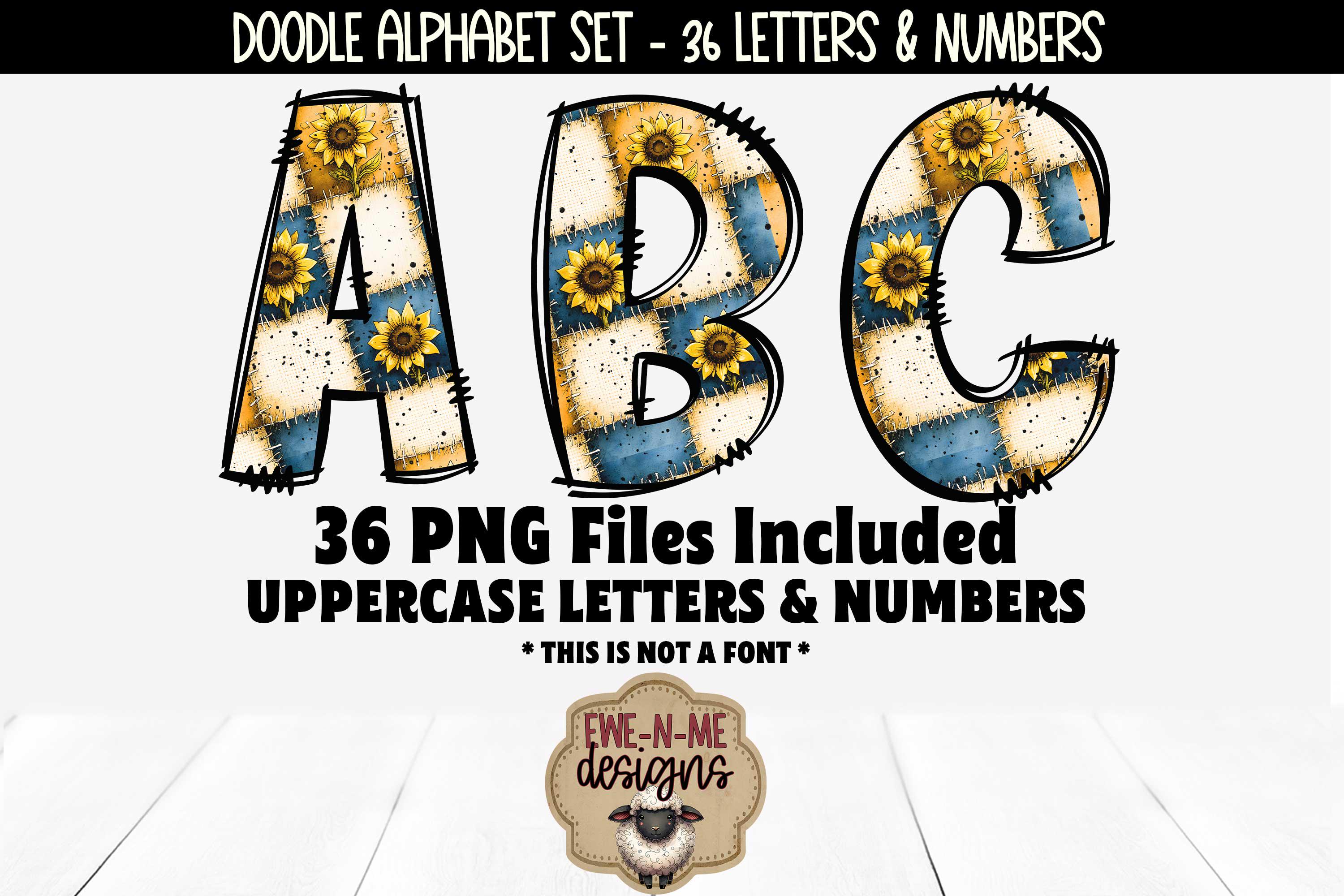 Sunflower Patchwork Alphabet & Numbers - Doodle PNG Files for Sublimation - Quilted Blue Gold Letters and Numbers